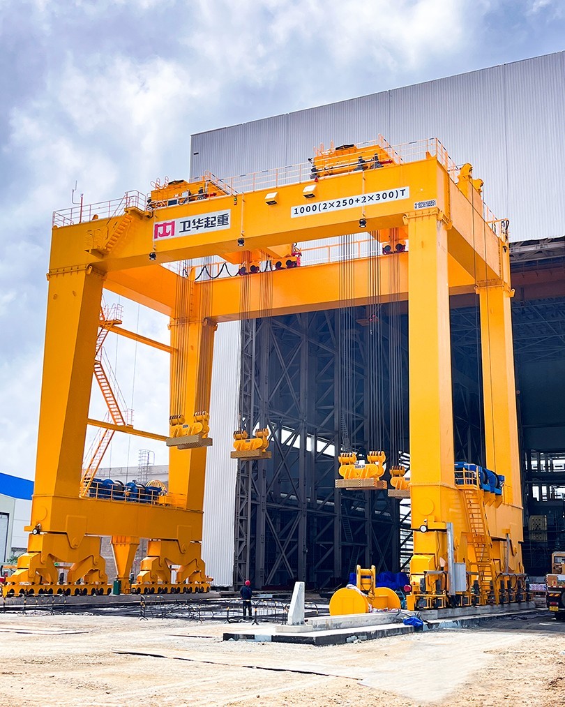 根据项目起吊重量大、工况复杂、控制精度高等特点,jinnian金年会起重机采用U型门架结构,双龙门四点吊装,最大起吊重量1000t,最大吊点高度大于18m,采用变频+PLC控制,可实现横向、纵向距离可调,及吊梁自由旋转,控制精度达±1mm。