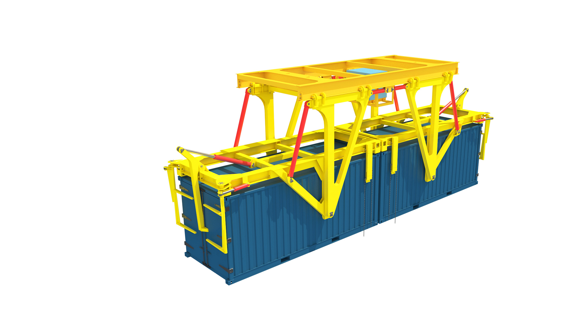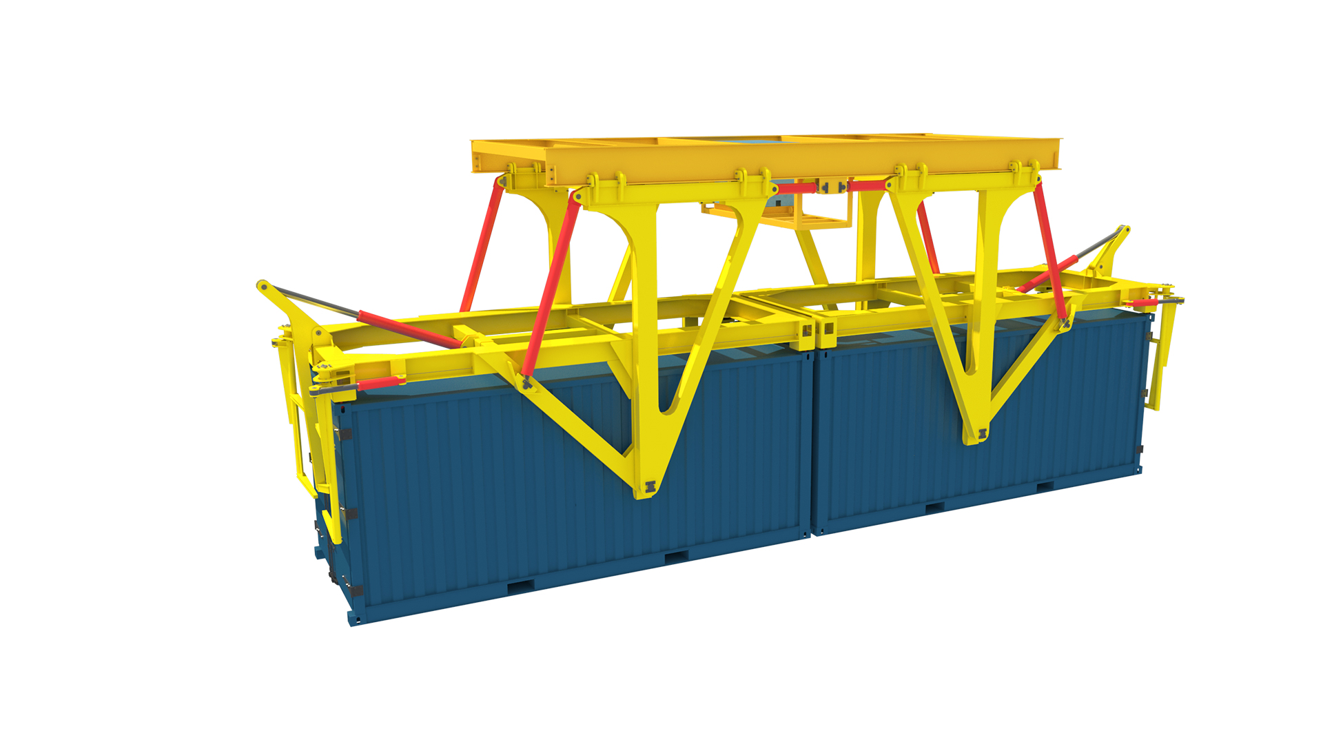 集装箱倾翻吊具遥控操作、全液压驱动,具有倾翻机构、伸缩机构、箱门开闭机构等,性能稳定,安全高效,作业效率较传统方式提高约70%。